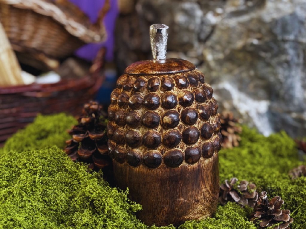 Tento velký dřevěný žalud je víc než jen dekorace; je to sochařský prvek, který do interiéru vnáší klid a stabilitu přírody. Jeho velkorysé rozměry z něj činí nepřehlédnutelný doplněk, který v prostoru působí uklidňujícím a přirozeným dojmem. Díky své robustnosti a jemné struktuře dřeva se stane elegantním středobodem, který spojuje moderní bydlení s krásou lesních plodů.